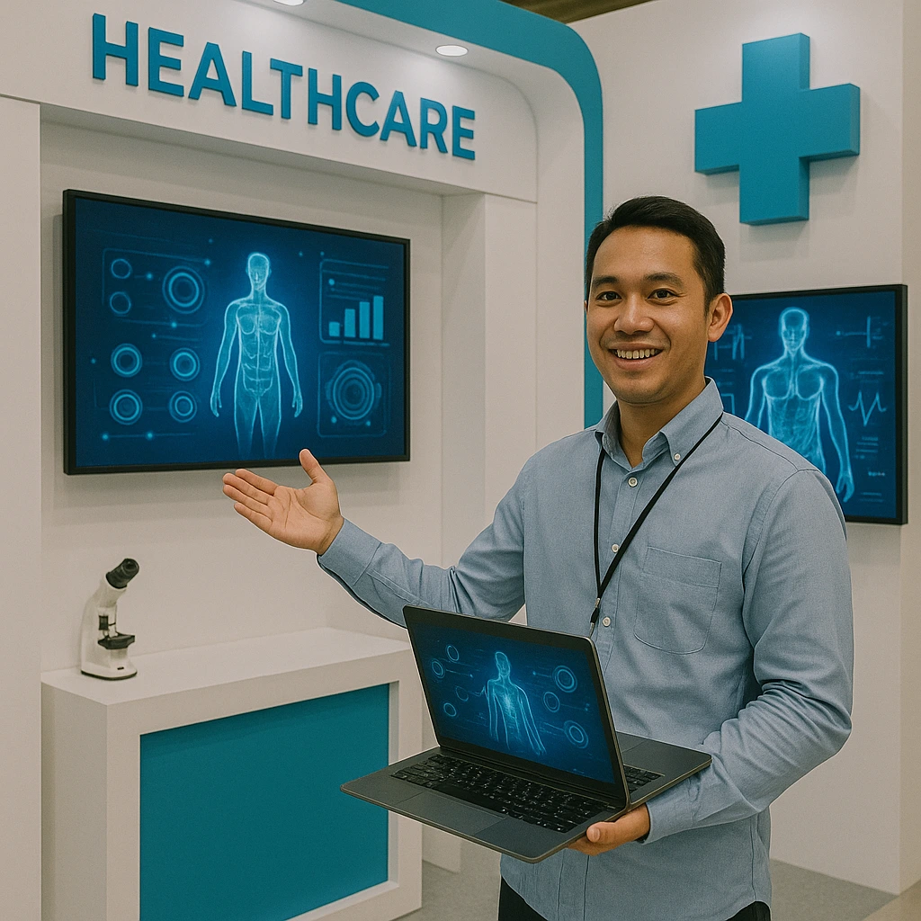 Booth Pameran Kesehatan dengan Desain Interaktif untuk Meningkatkan Branding Alat Medis dan Farmasi